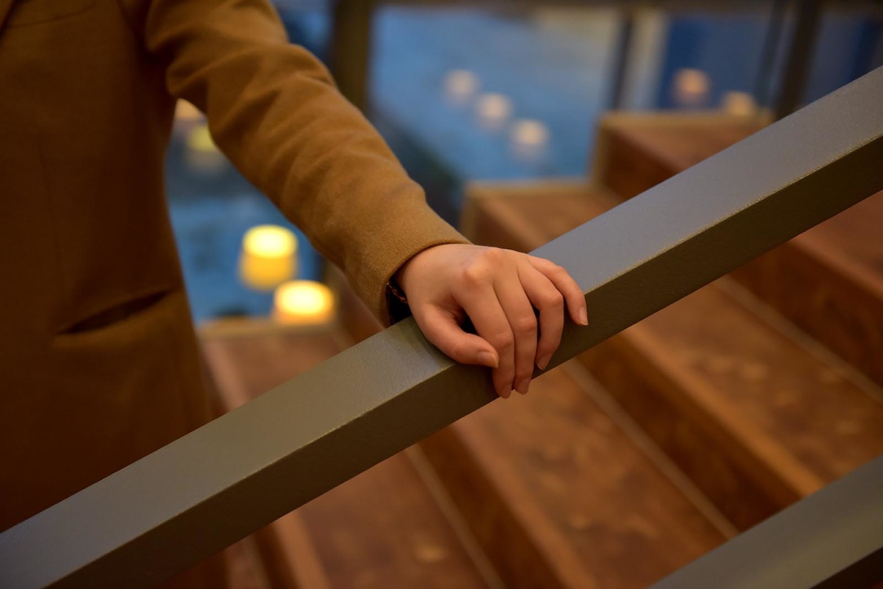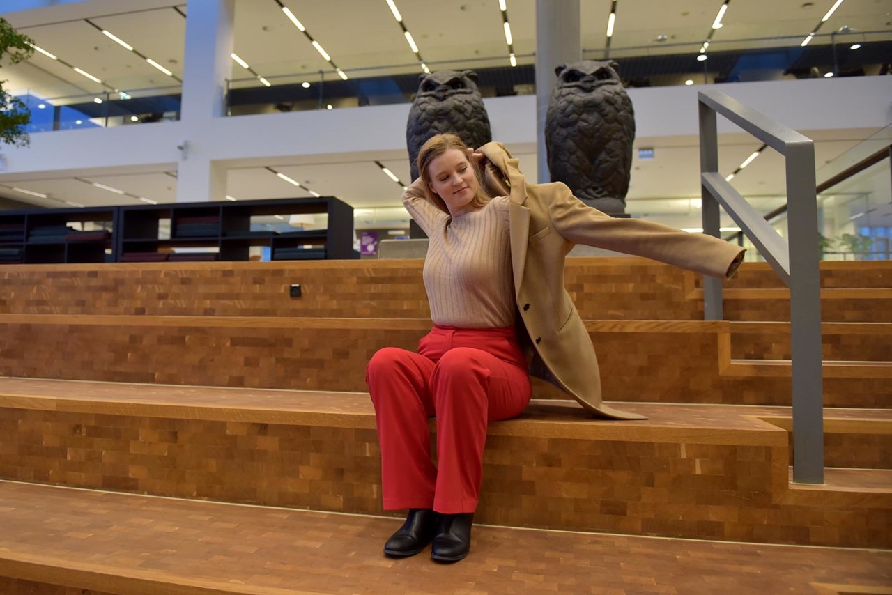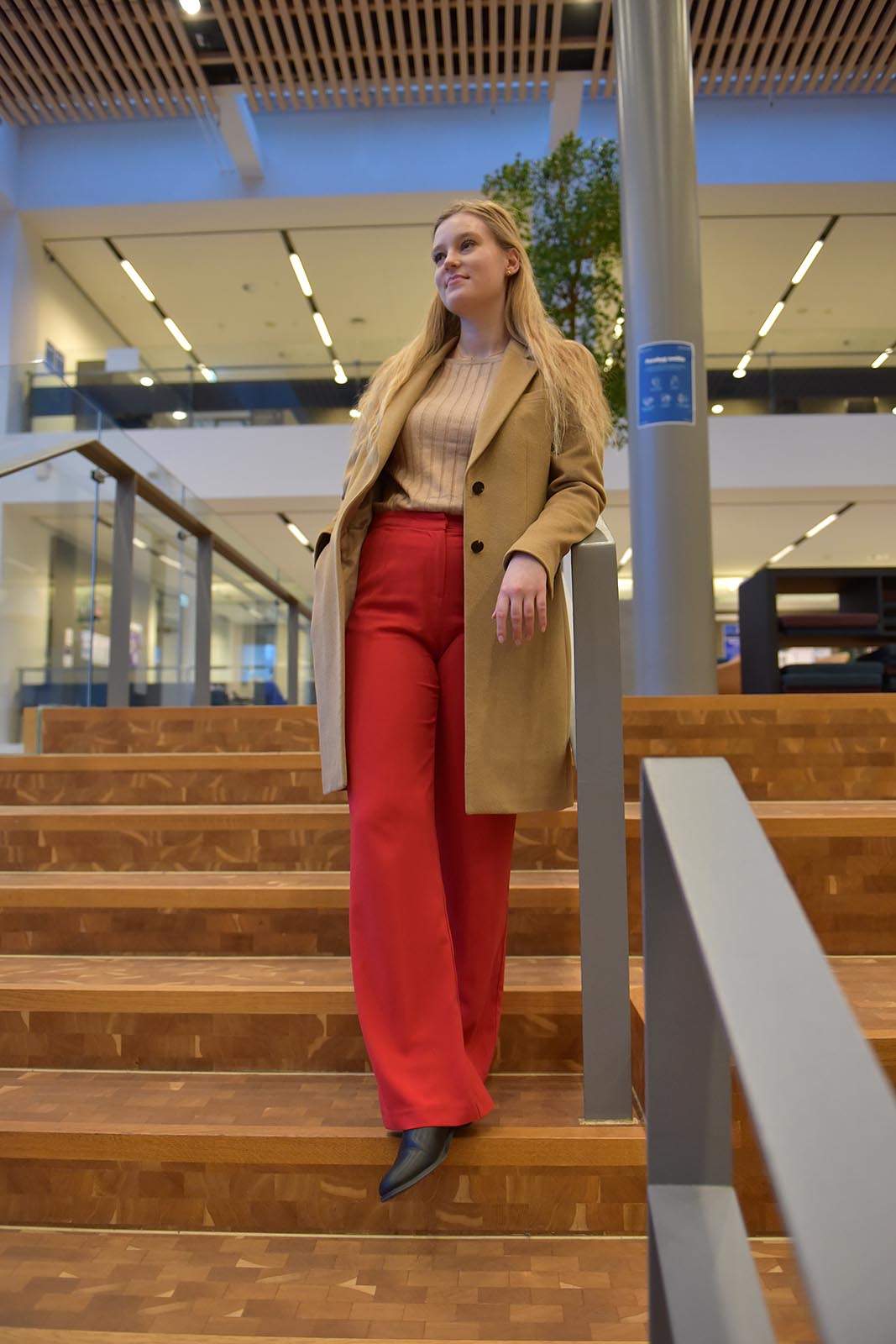 Hun er i gang med sit syvende semester på det Juridiske Fakultet, og vi mødes i Atriet. Et stort åbent område, hvor man som jurastuderende kan sidde med alle lovteksterne eller bare en kop kaffe. I Atriet er der en masse små kroge, man kan liste sig ind i, og vi vælger et opholdsrum, der kaldes Pejsestuen. Og her er da også en pejs, godt nok i plastik, men ikke desto mindre med orange lys og knitrende lydeffekter.