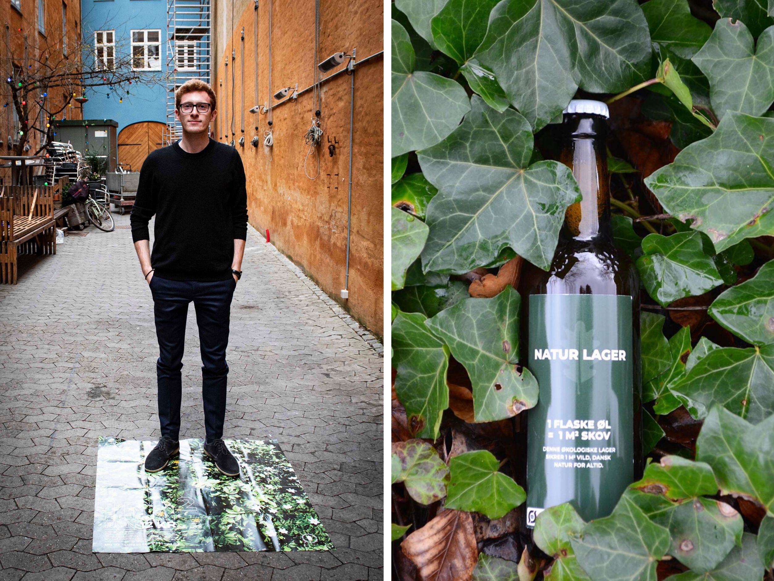På bordet foran ham står en af øllene og bliver lunken langt fra køleskabet. Den skjuler ikke sin mission: Mærkatet er grønt i to nuancer, og i kontrast til de mangefarvede illustrationer, der normalt pryder øl fra Nørrebro Bryghus, forklarer en simpel hvid tekst, hvad kundernes kroner går til: »1 flaske øl = 1 m2 skov«.