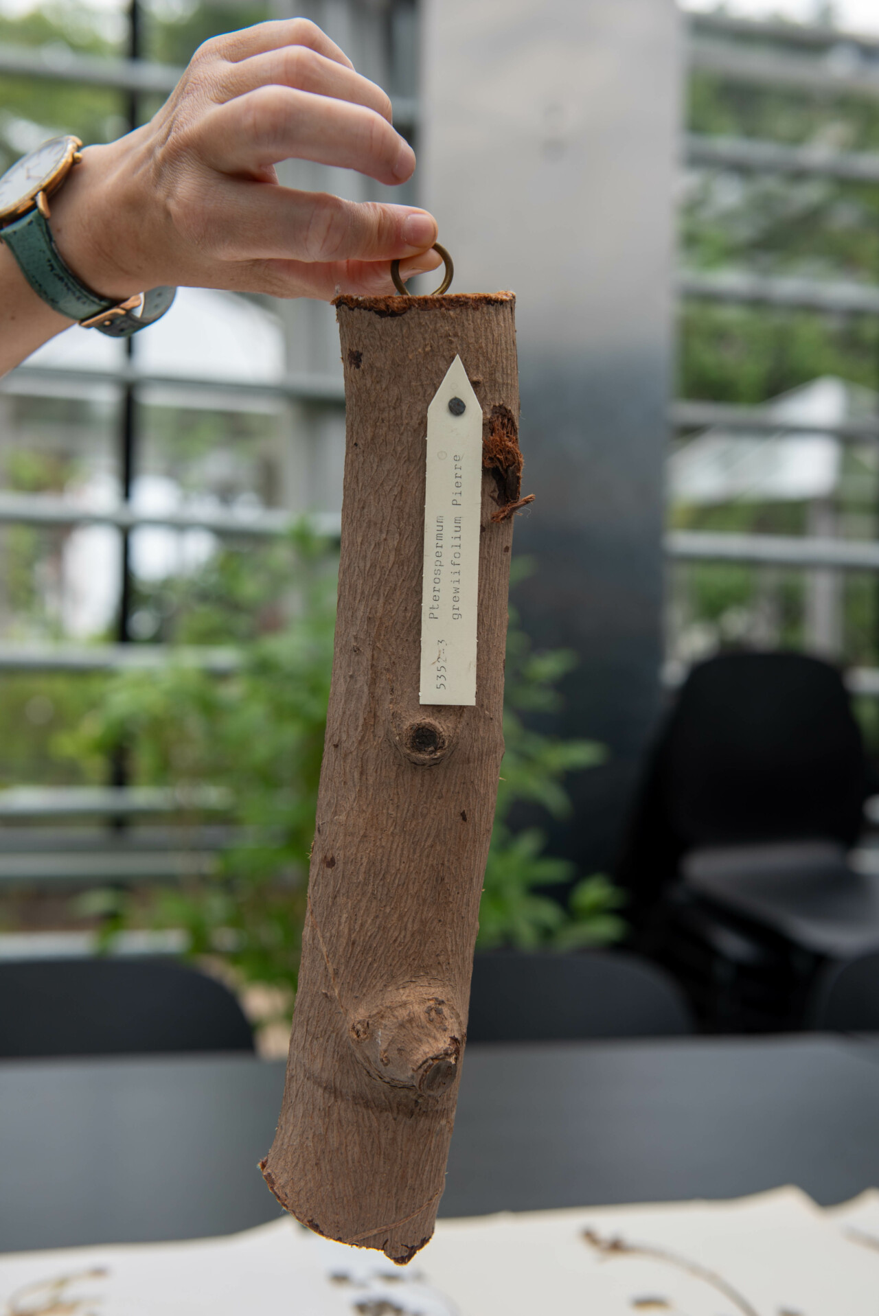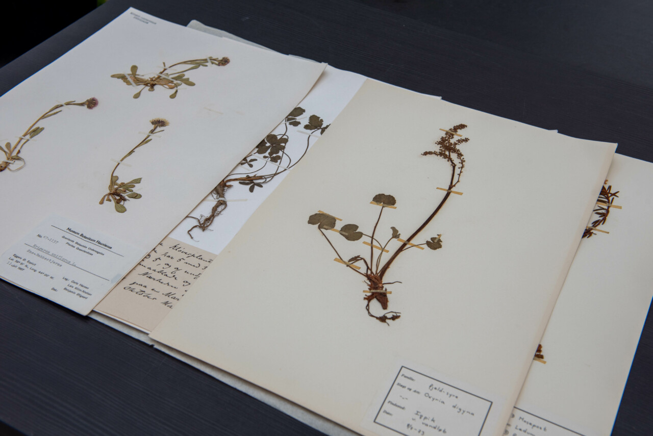 Et stykke træ, et herbarieark, en papirpose med frø og en plante i en kolbe fyldt med sprit. Den døde samling er magasineret på et lager uden for København.
