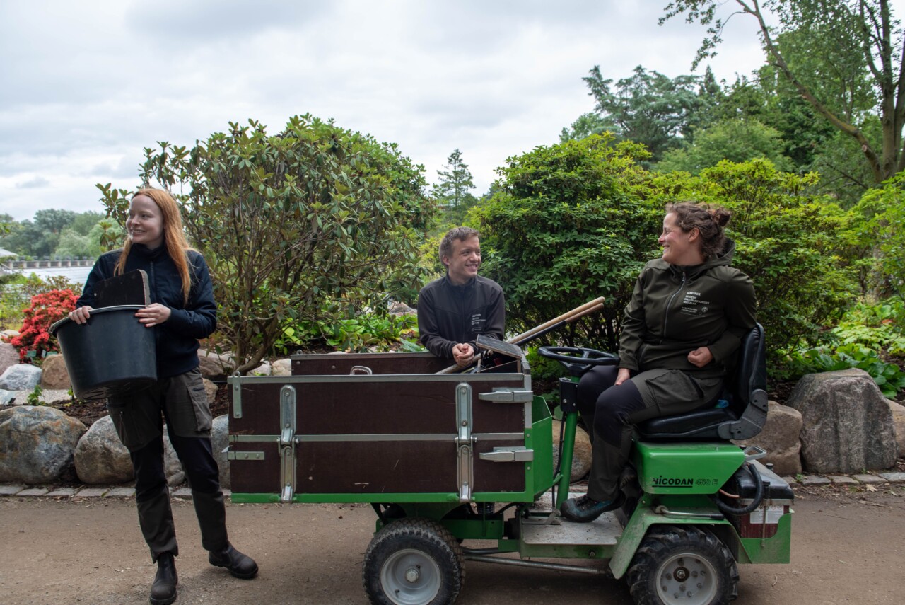 Bedst som vi står og beundrer den gamle gartnerbolig, der i dag benyttes til kontorer, kører to gartnere og en gartnerelev forbi i en havetraktor med lad.