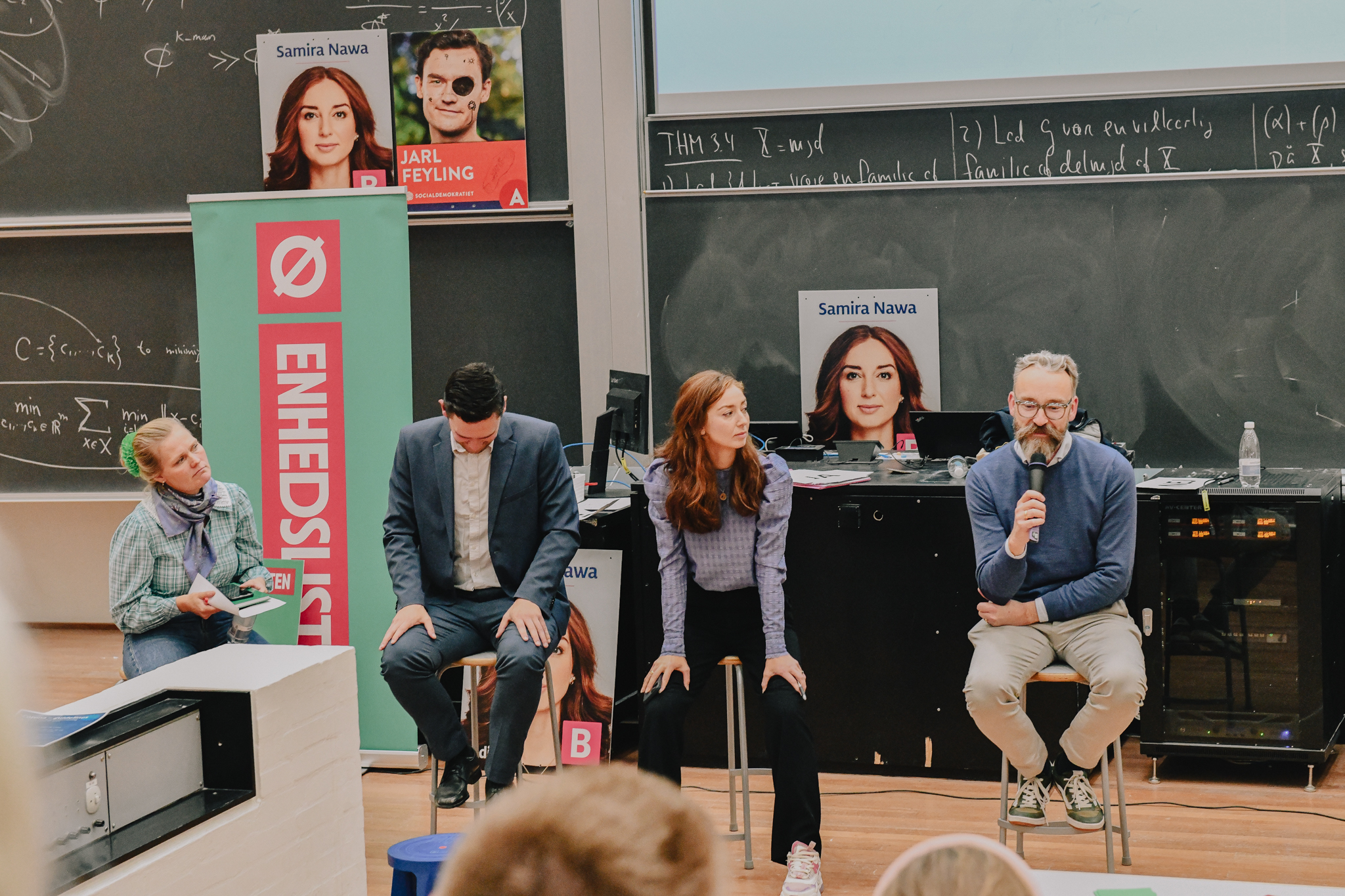 Der skulle have været seks debattører, men både Alexandra Sasha fra Venstre og den konservative Laura Lindahl, meldte afbud inden aftenens arrangement. Måske derfor henvender Morten Meldal sig flere gange til den eneste borgerlige stemme, Ole Birk Olesen, når han efterfølgende får taletid.