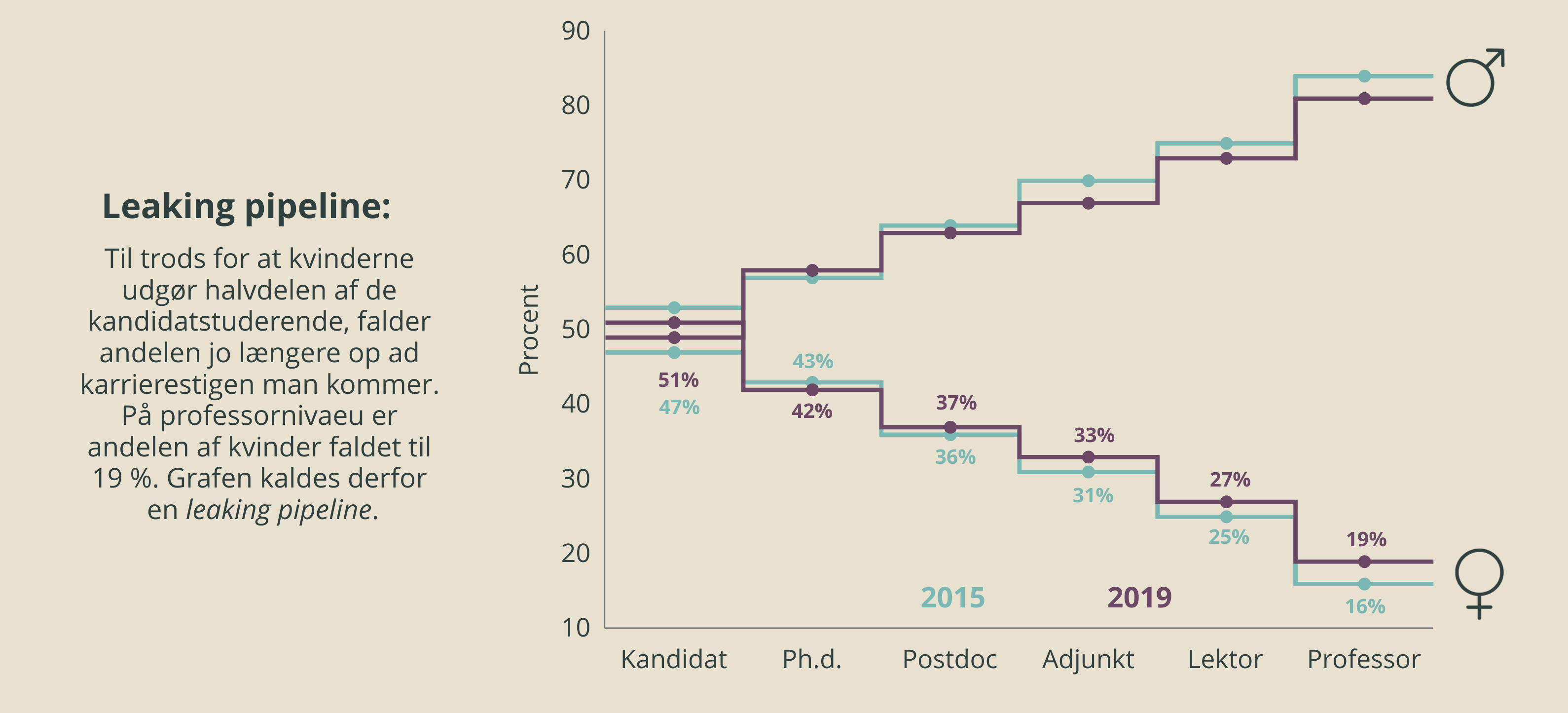 Ifølge Lise Arleth var kønsbalancen på kandidatniveau på SCIENCE den samme – 50/50 – for 20 år siden. Fra at have en ligelig fordeling på kandidatniveau, falder andelen af kvinder til 42 procent på ph.d.-niveau, 37 procent på postdoc-, 33 procent på adjunkt-, 27 procent på lektor-, og altså ned til 18 procent på professorniveauet i 2019.
