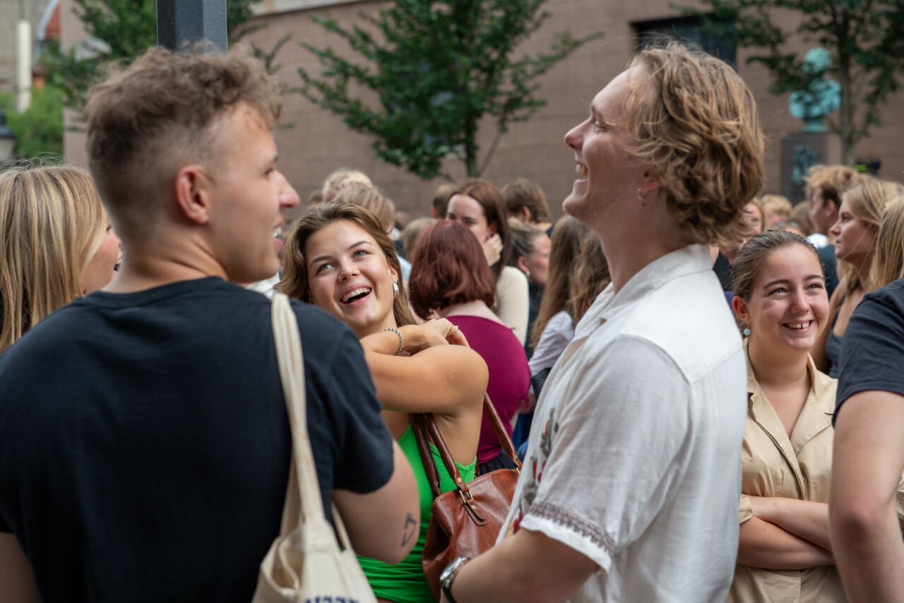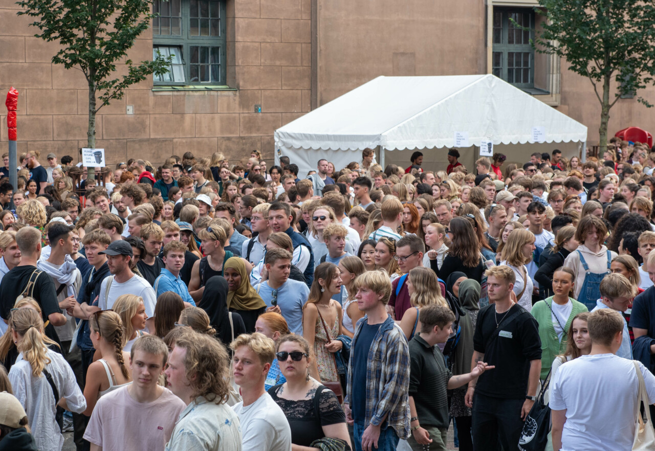 For mange af de nye studerende markerer immatrikulationen det allerførste møde med deres nye universitet. De var mødt talrigt op og måtte flere gange gennes længere ind på den propfyldte Frue Plads, så der kunne blive plads til alle.