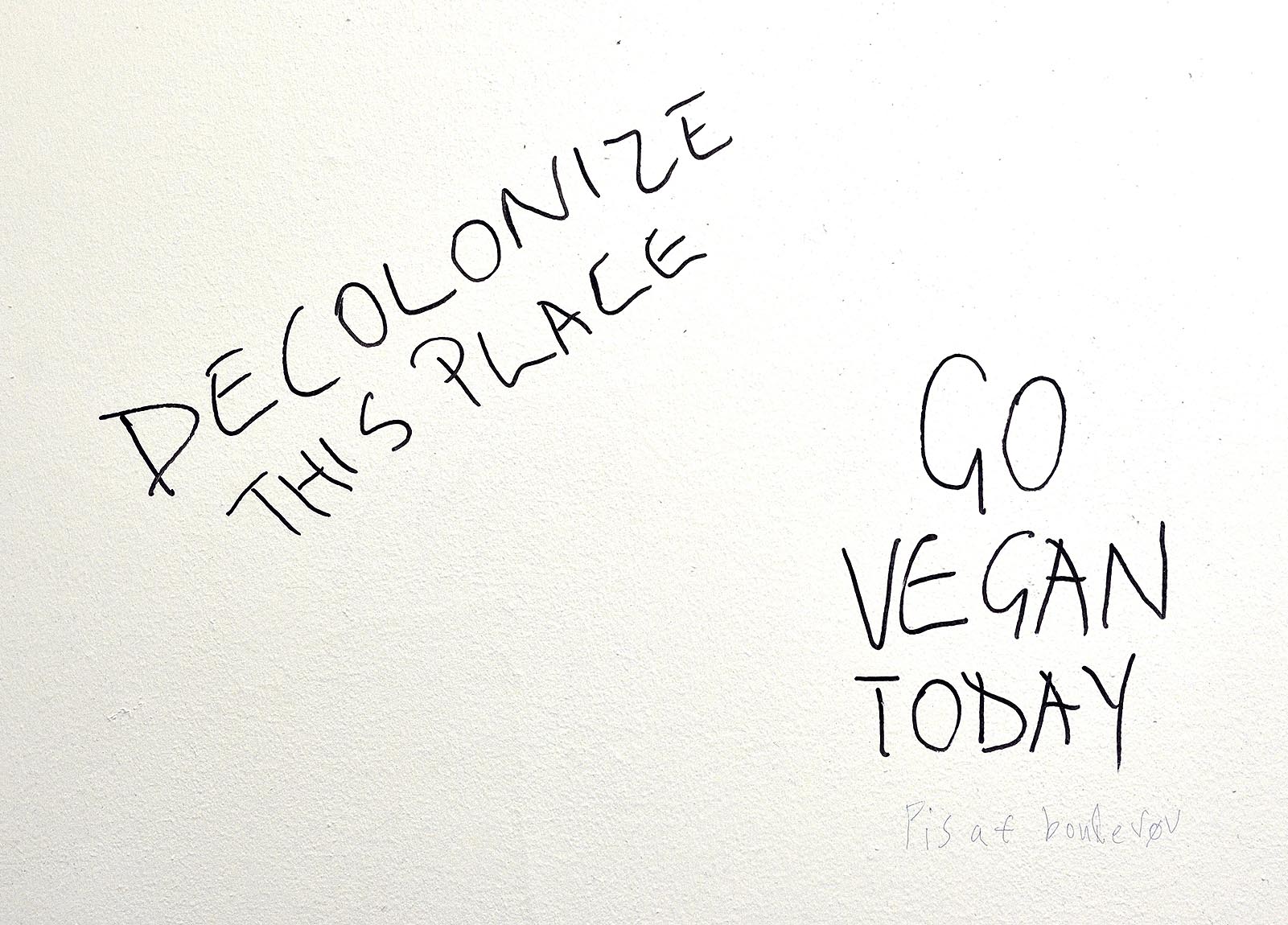 »GO VEGAN TODAY« (efterfulgt af: »Pis af bønderøv«)