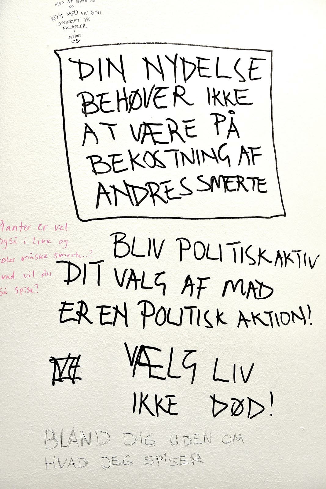 »DIN NYDELSE BEHØVER IKKE VÆRE PÅ BEKOSTNING AF ANDRES SMERTE« (hvortil der er svaret: »lad være med at skabe dig og kom med en god opskrift på falafler i stedet :)«)