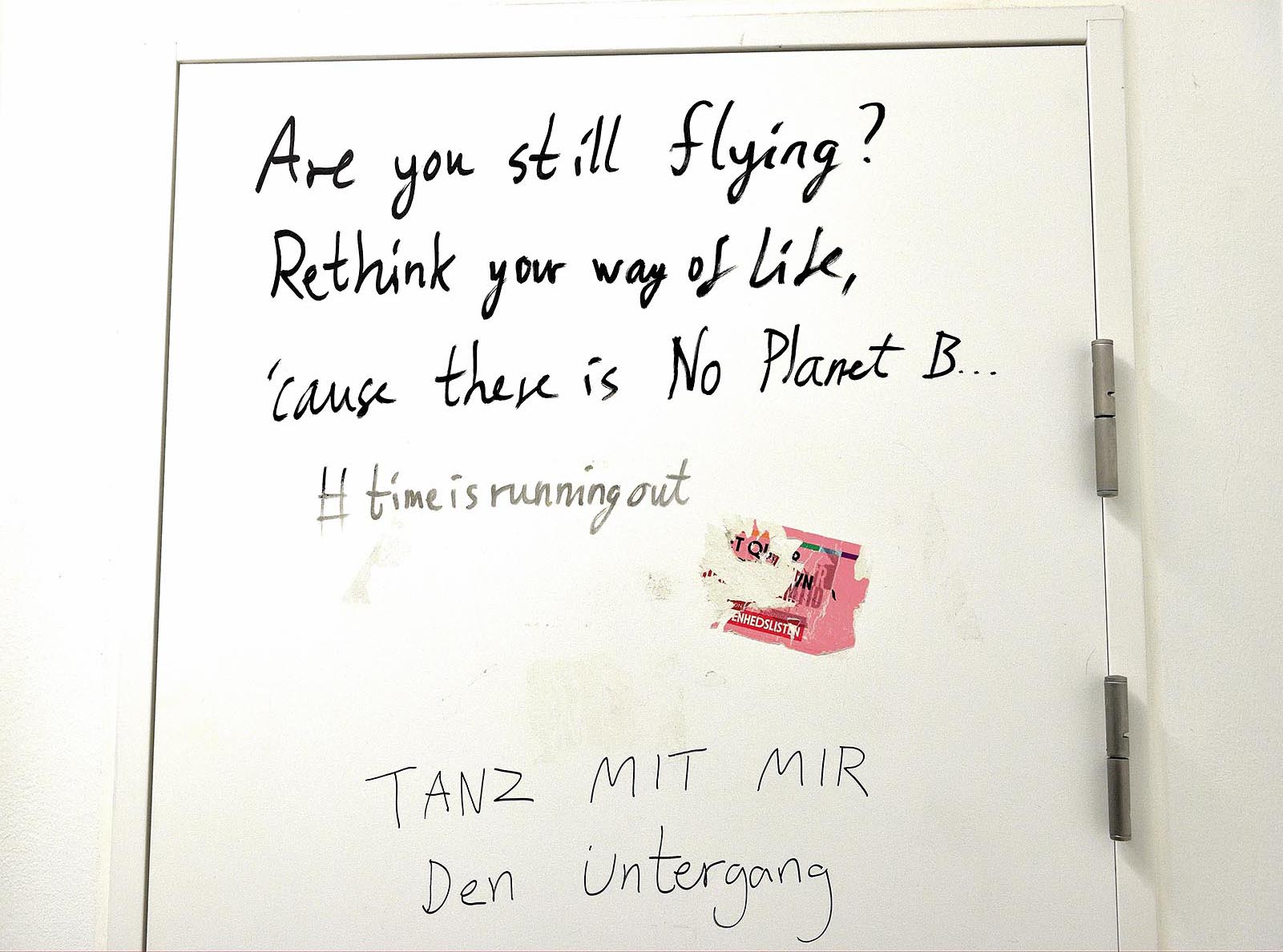 På KUA2 behøver man ikke hive sin mobil op af lommen for at få tiden til at gå, mens man gør sin business på kummen. En heftig politisk debat – både ond og sjov – udspiller sig nemlig på væggene omkring én.