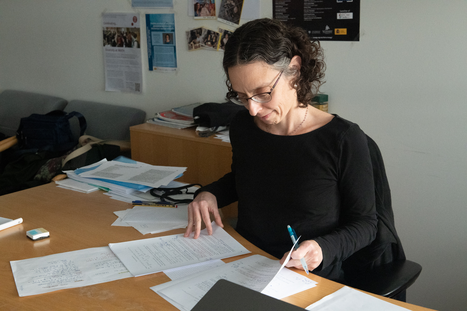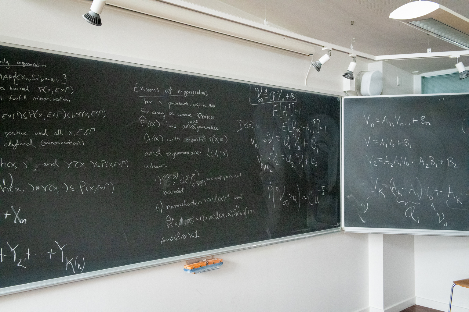 Men på væggen hænger en fire meter lang, sort kridttavle – matematikernes foretrukne arbejdsredskab. De hader whiteboards, fortæller hun, og er kræsne med deres kridt. På en reol står en næsten tom æske med ekstra kraftige japanske kridt.