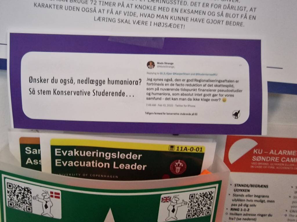Univalg 2022 — Anarkistiske Studerende har hængt plakater rundt om og i flere tilfælde oven på Konservative Studerende og Frit Forums plakater. De er nu pillet ned af selvsamme foreninger. Alle mener, at de andre begår hærværk.