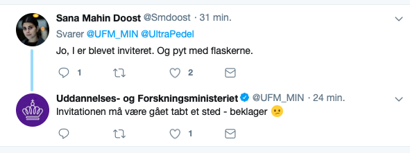 Twitter — Uddannelses- og Forskningsministeriet dukkede ikke op til studenterleder Sana Mahin Doosts afskedsreception. På twitter går striden nu om, hvorvidt embedsfolkene blev inviteret eller ej.