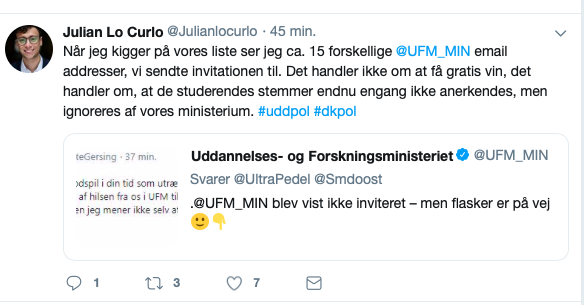 »Det handler ikke om at få gratis vin, det handler om, at de studerendes stemmer endnu engang ikke anerkendes, men ignoreres af vores ministerium,« står der blandt andet i Julian Lo Curlos tweet-svar til ministeriet.