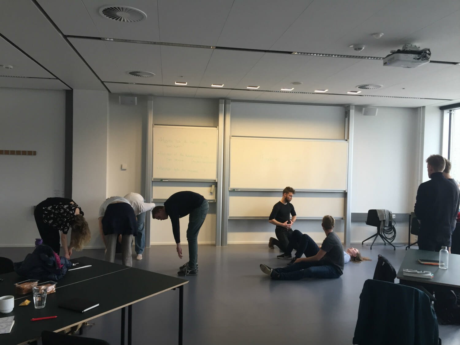En gruppe studerende hvisler slangelyde i det ene hjørne af rummet. Bag dem svinger en anden gruppe armene rundt i kringlede gymnastikøvelser. Og ved vinduet har en håndfuld studerende lagt sig ned, så lange de er.
