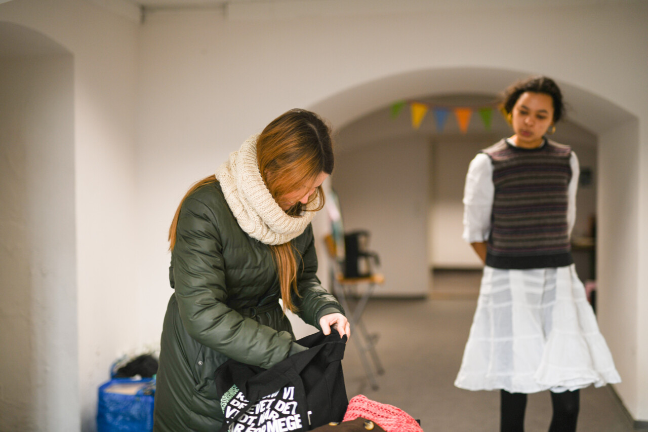 Mens vi taler, kommer en af Raramais studieveninder ned i butikken med et par poser fyldt med tøj, som hun ikke går med længere, og de tre studerende sorterer det sammen, mens vi taler.
