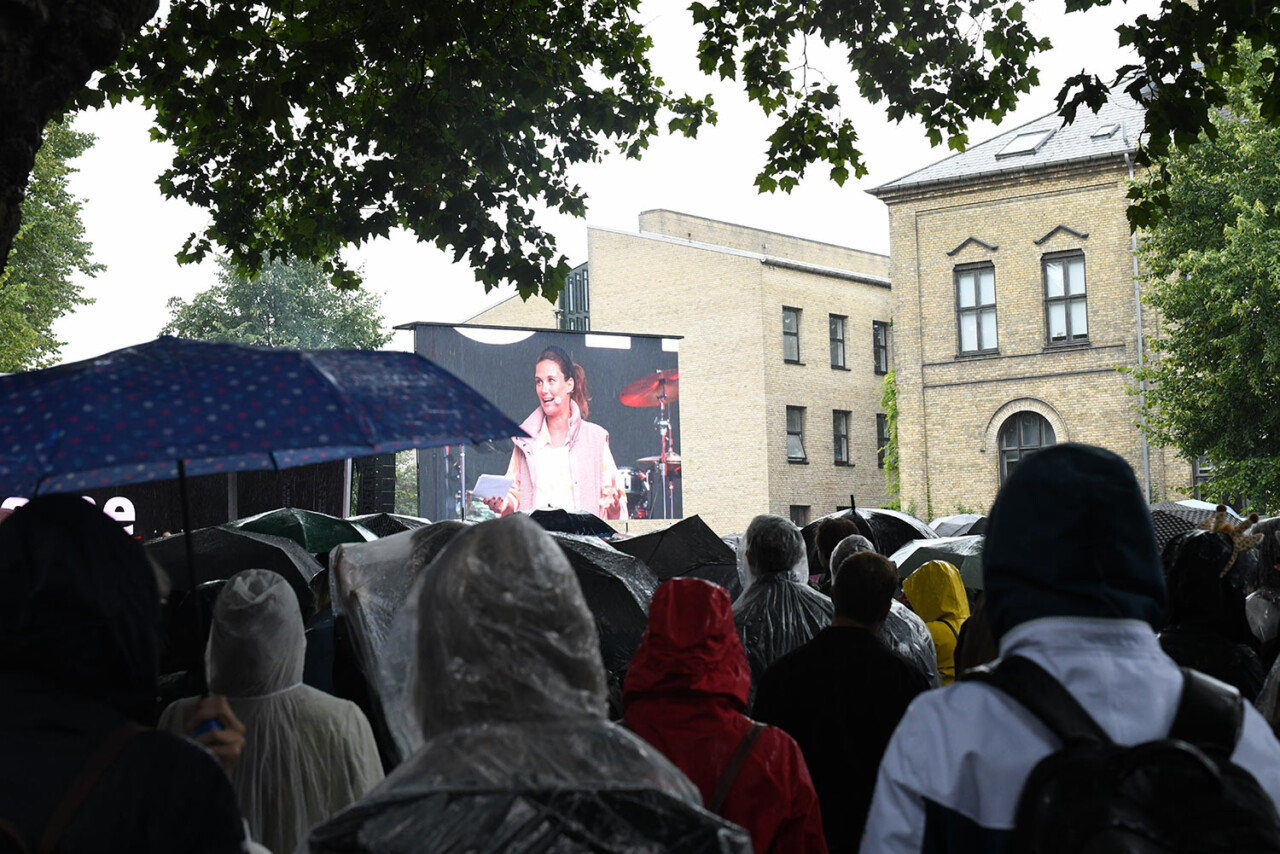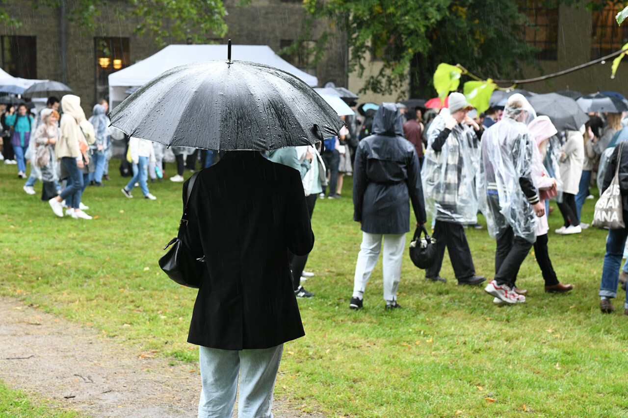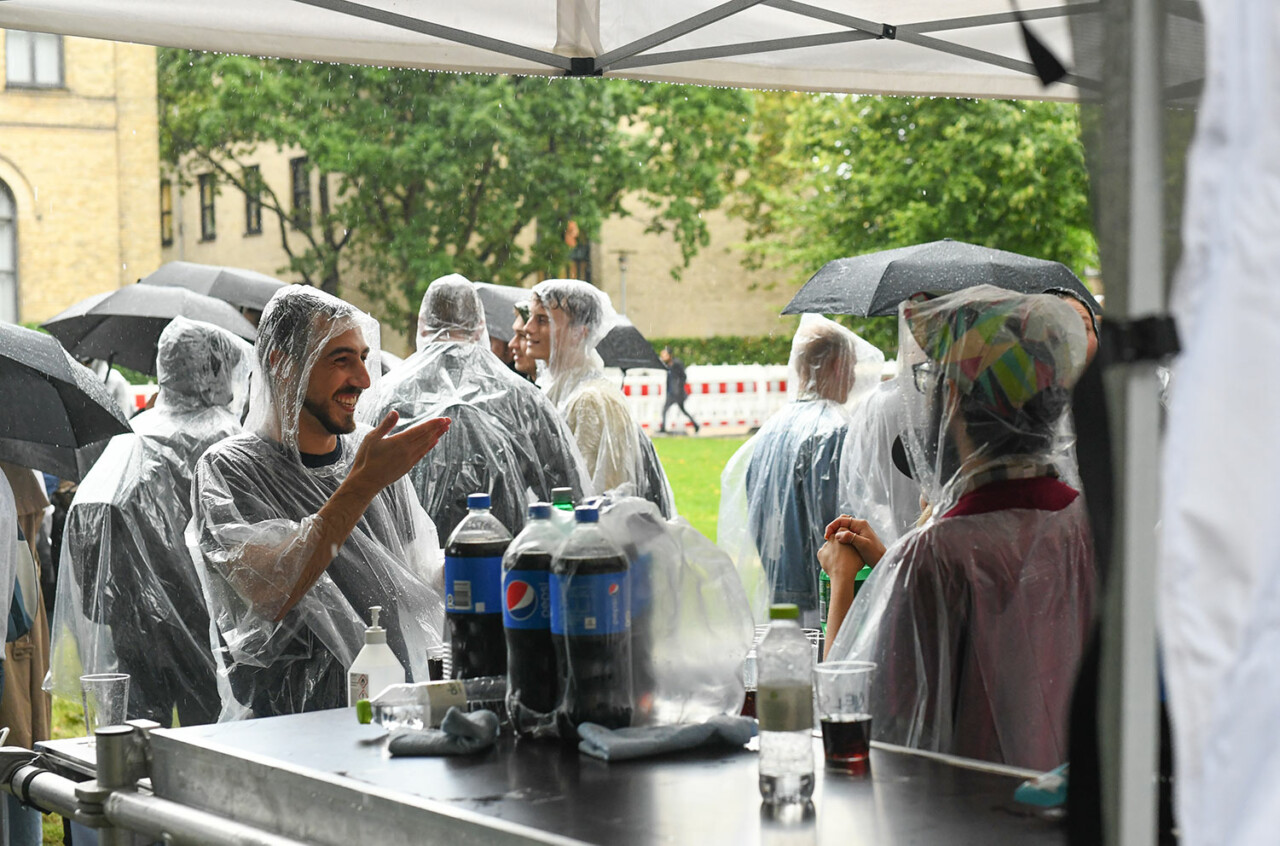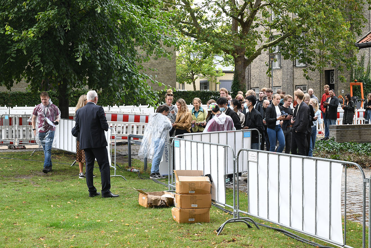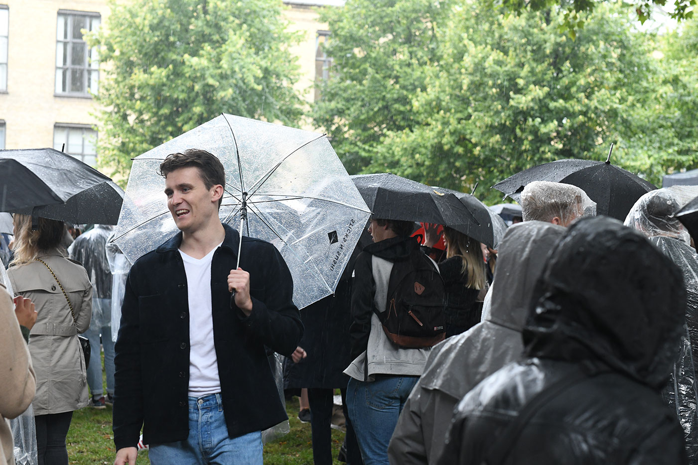 I år minder festen mere om sig selv. Nok er den rykket ud af Festsalen ved Frue Plads (der lægger brosten til et testcenter) og hen til et udendørsareal på Frederiksberg Campus, og nok er der et loft over antallet af studerende, men det sociale liv bobler igen – på trods af heftigt regnvejr.