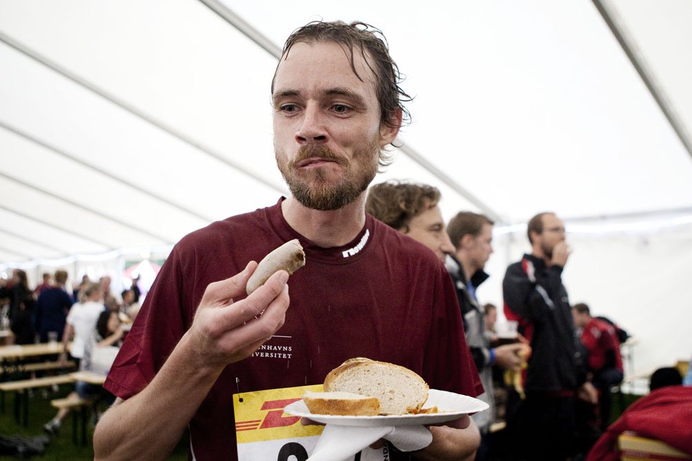 Billedmontage fra årets stafet i Fælledparken med lydtapet af stønnende, snakkende, skubbende og pølsespisende løbere fra hele Københavns Universitet