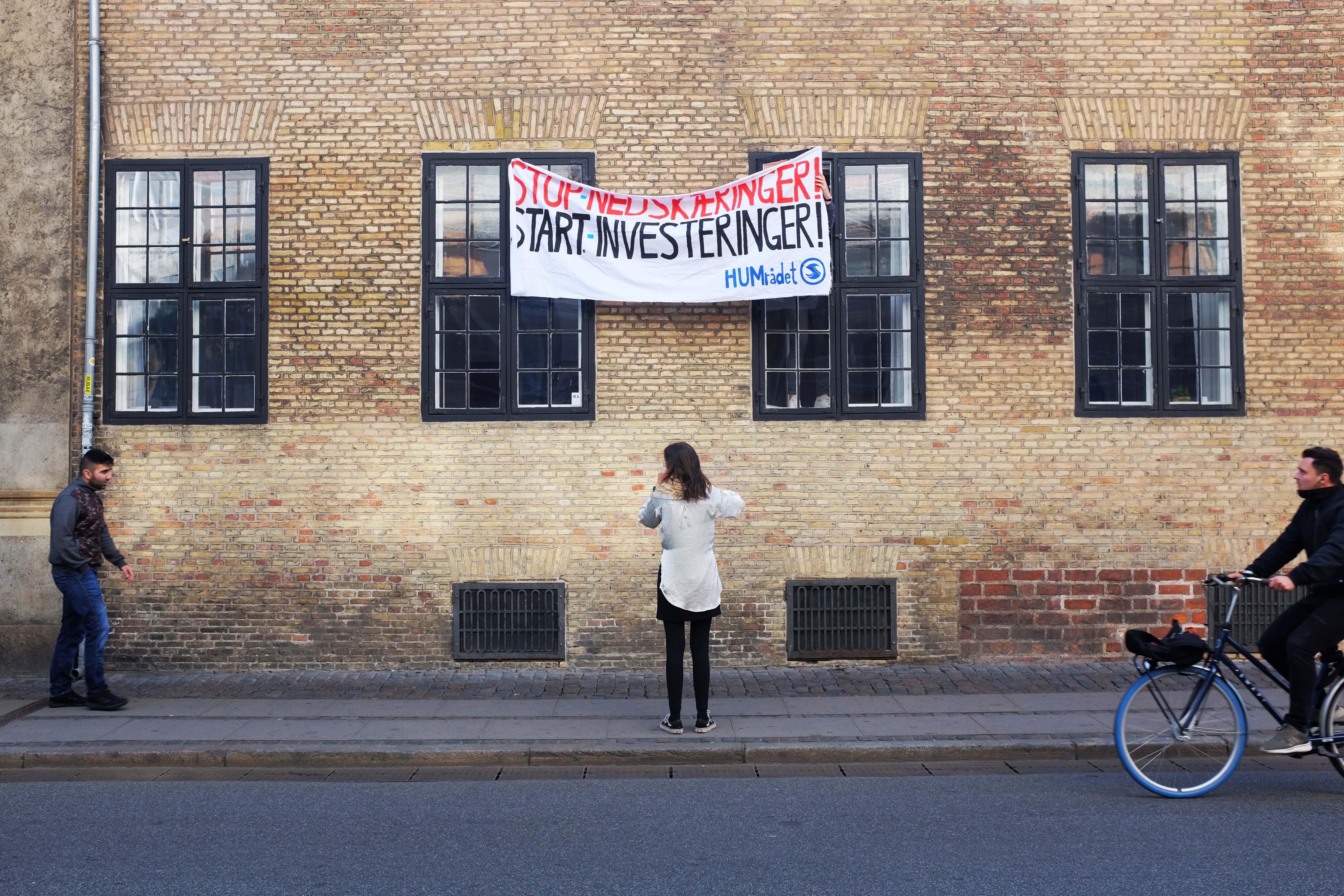 Katharina Petersen, der læser fransk, løber ud på gaden for at hjælpe banneret fra det ene vindue til det andet. ‘STOP NEDSKÆRINGER! START INVESTERINGER!’ står der.