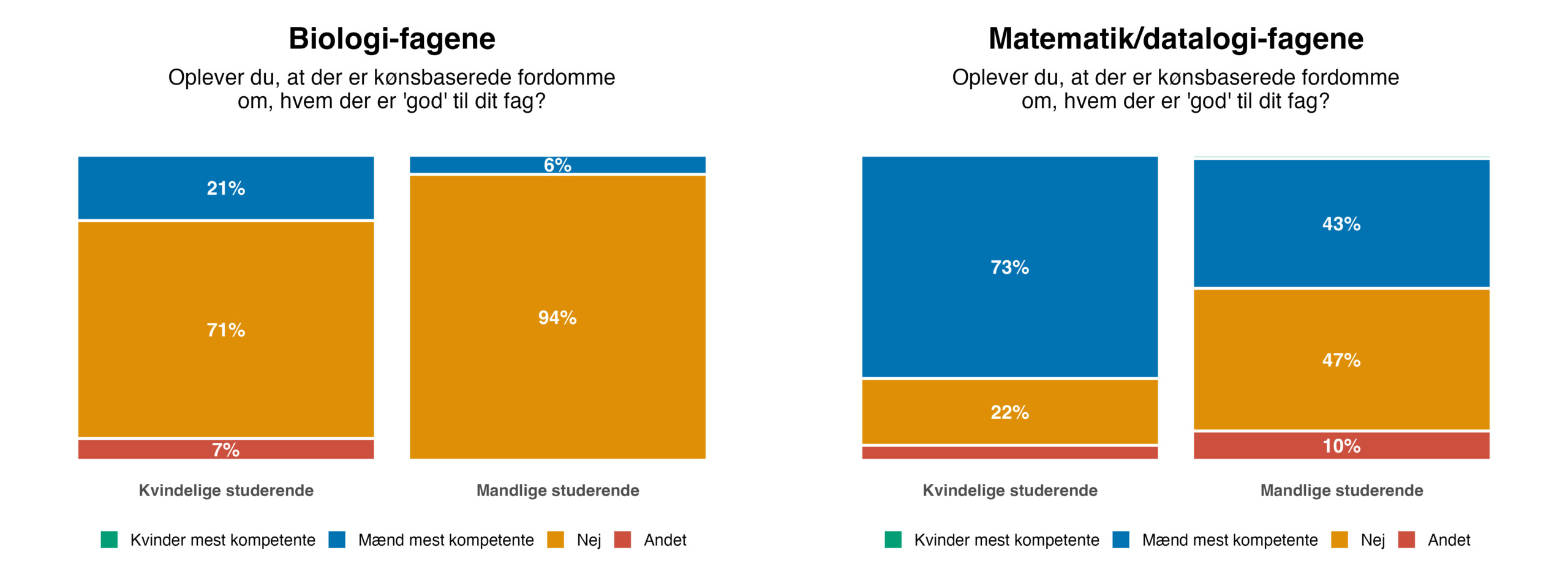 For at undersøge, hvilken rolle køn spiller i de studerendes forestillinger om fagene og deres praksis, spurgte vi, om de oplevede kønnede stereotyper om, hvem der er god til deres fag. Her var der en markant forskel mellem de to grupper af fag. På bio-fagene havde 80 procent af de studerende en oplevelse af, at der ikke var kønsbaserede fordomme på deres studie. På mat-dat-fagene var billedet et andet. 73 procent af de kvindelige studerende svarede, at de oplevede kønsbaserede fordomme om, at mænd er bedst til deres fag.