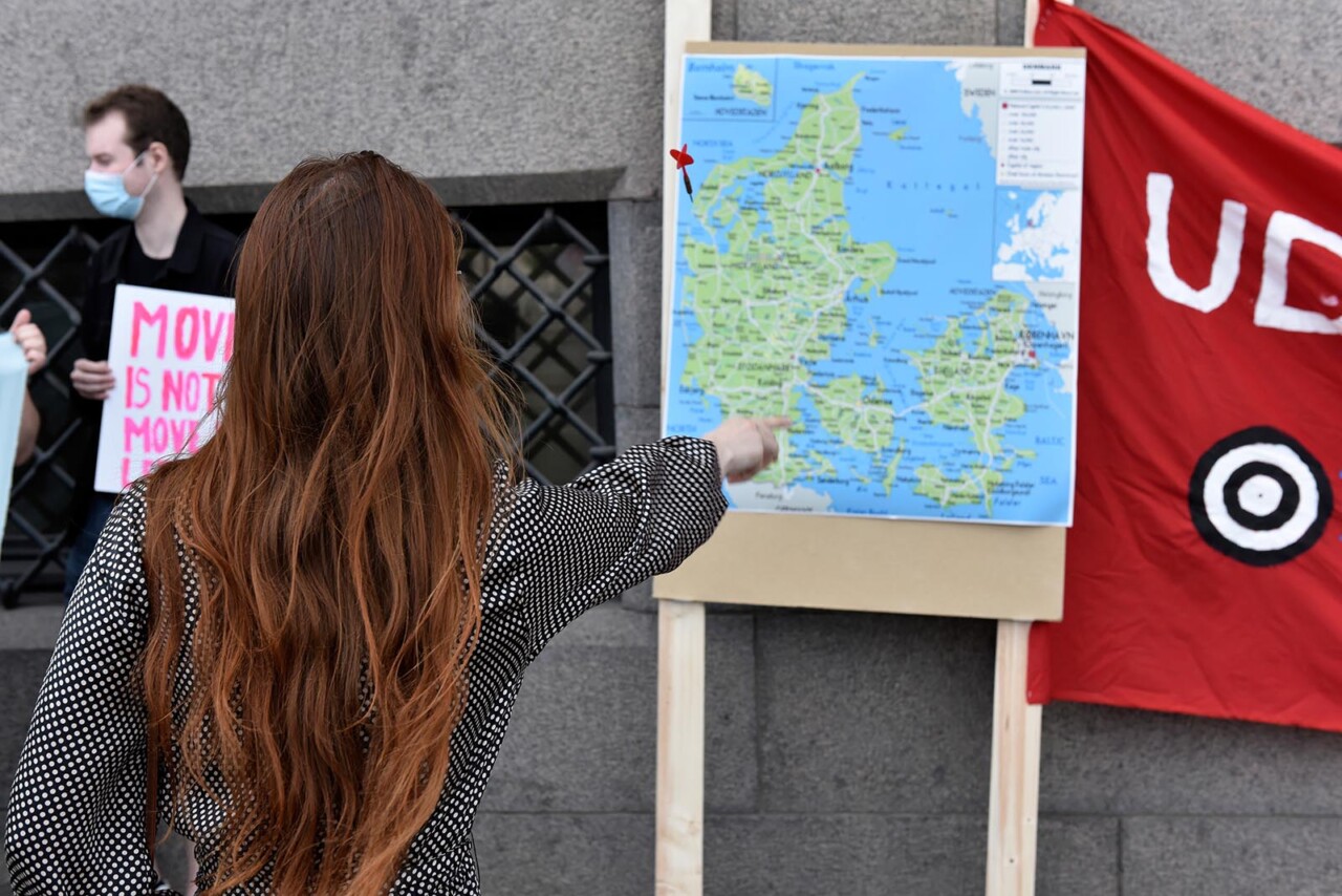 Flokken af demonstranter samler sig om to danmarkskort, der flankerer et stort rødt banner med teksten: ’Uddannelsesdart’.