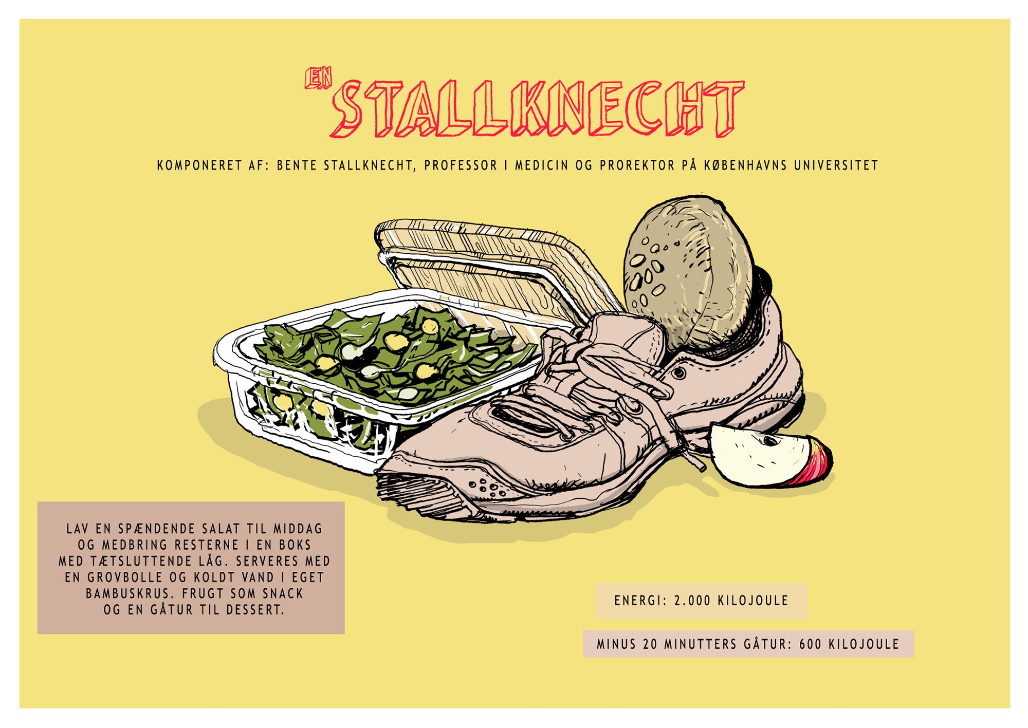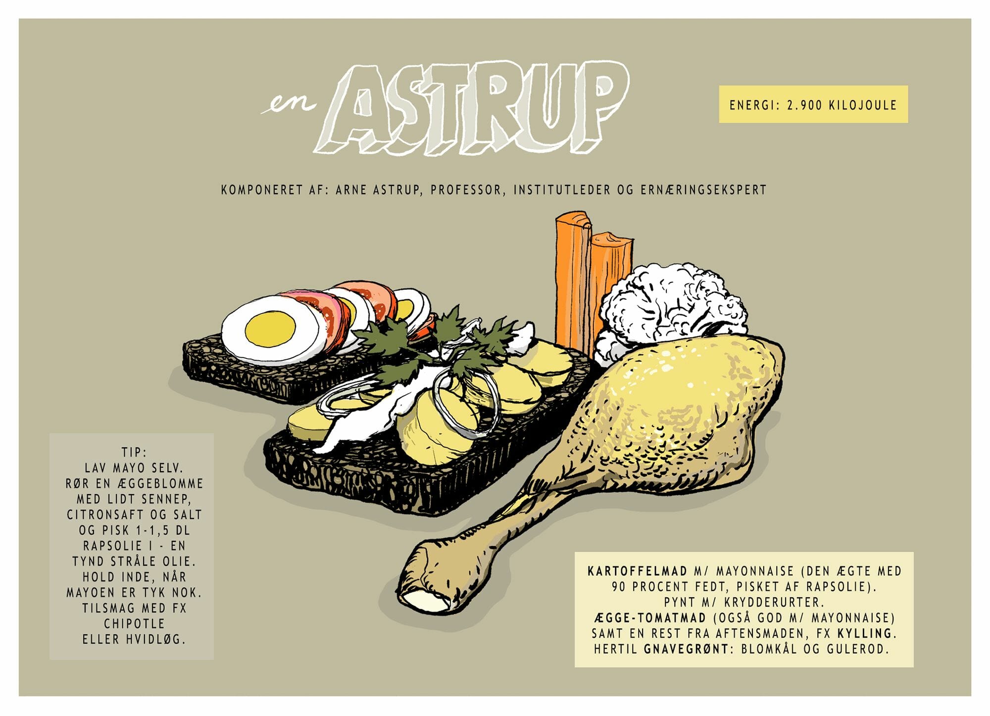 Vi har i energiberegningen støttet os til den madpakke – lad os kalde den baseline-madpakken – som vi fik tilsendt af Arne Astrup, professor og institutleder ved Institut for Idræt og Ernæring på Københavns Universitet. Astrup vedlagde nemlig en næringsberegning, som anslog hans madpakke til godt 2.200 kJ. Men blandt andet fordi rugbrødsskiverne på tegningen af Astrups madpakke er temmelig tykke, har vi lagt nogle kJ til den tegnede version. En mindre energirig version må læseren selv forestille sig; den er mulig.